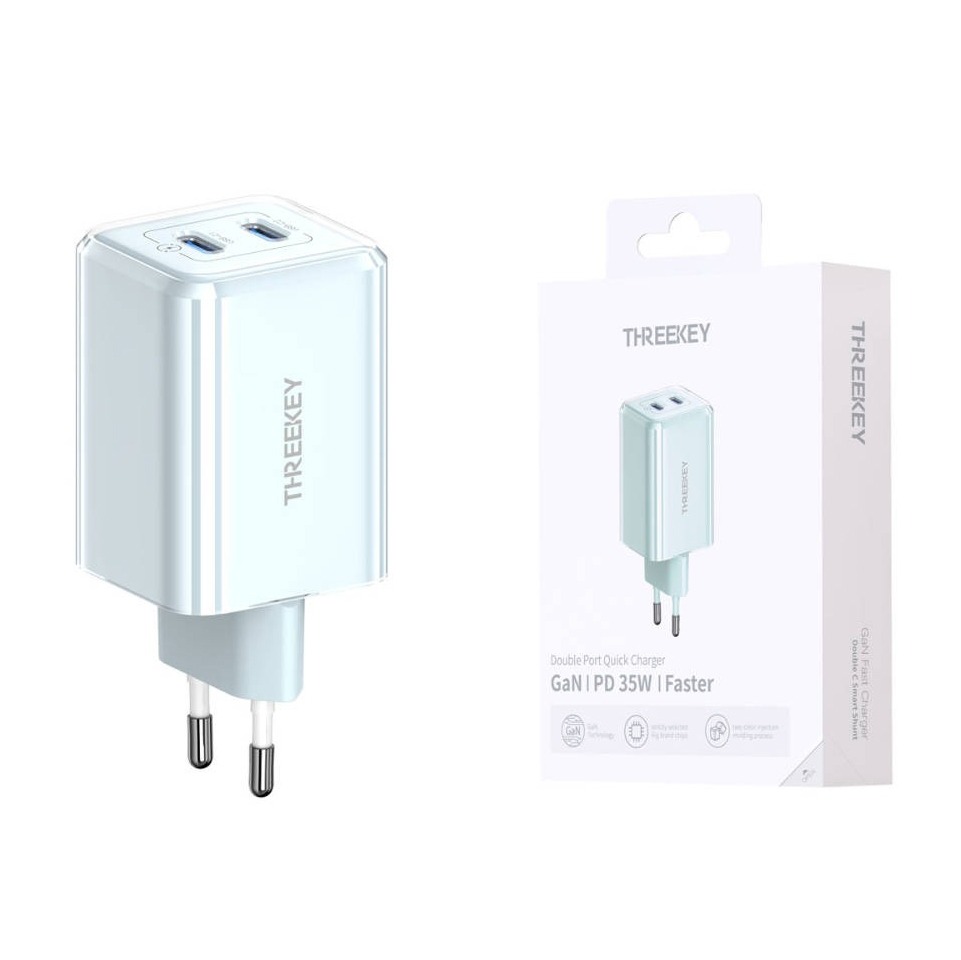 Сетевое зарядное устройство THREEKEY TK-111 GaN USB-C (35W) 2C, цвет голубой