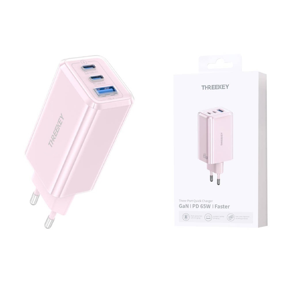 Сетевое зарядное устройство THREEKEY TK-113 GaN USB-C (65W) 2C1A, цвет розовый