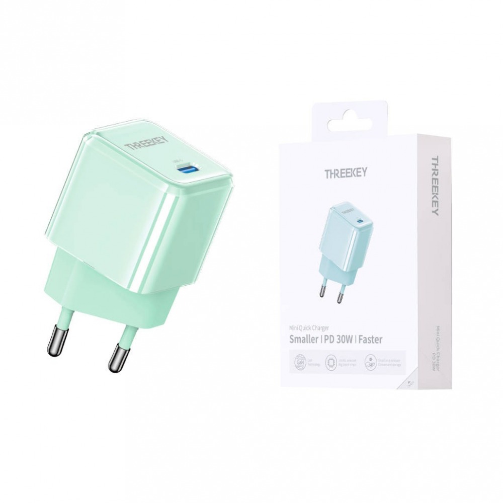Сетевое зарядное устройство THREEKEY TK-116 GaN USB-C (30W), цвет зеленый