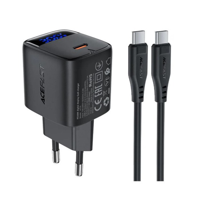 Сетевое зарядное устройство Type-C Acefast A115 (30W, PD, кабель Type-C-Type-C, GaN, с дисплеем) Черный