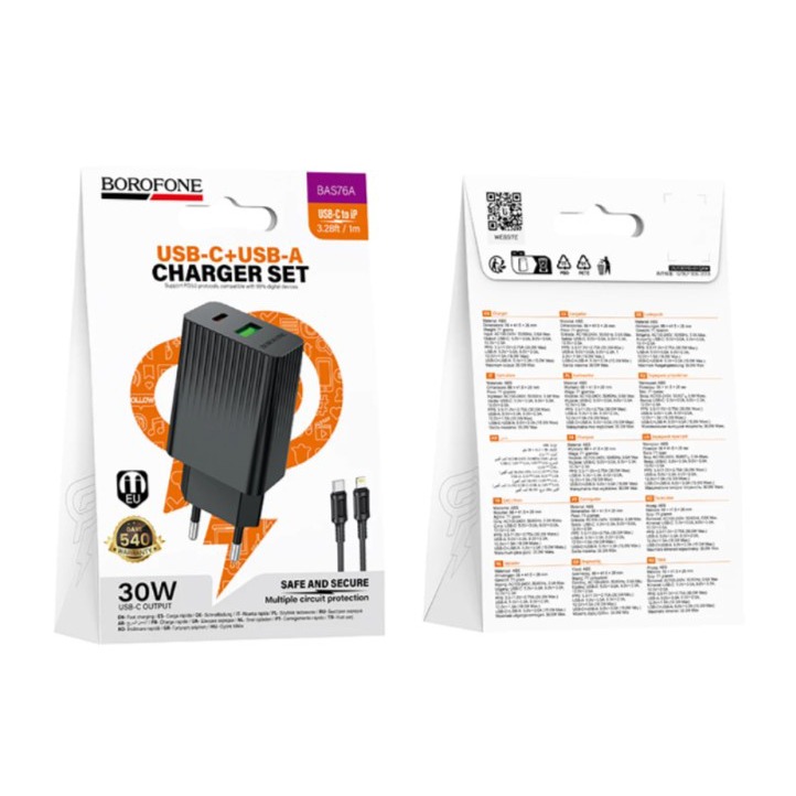 Сетевое ЗУ BOROFONE BAS76A + кабель Lightning/Type-C (USB QC3.0/PD 30W) черное