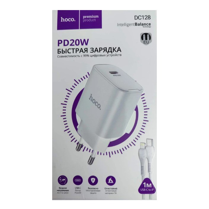 Сетевое ЗУ HOCO DC128 + кабель Lightning/Type-C (PD 20W) белое