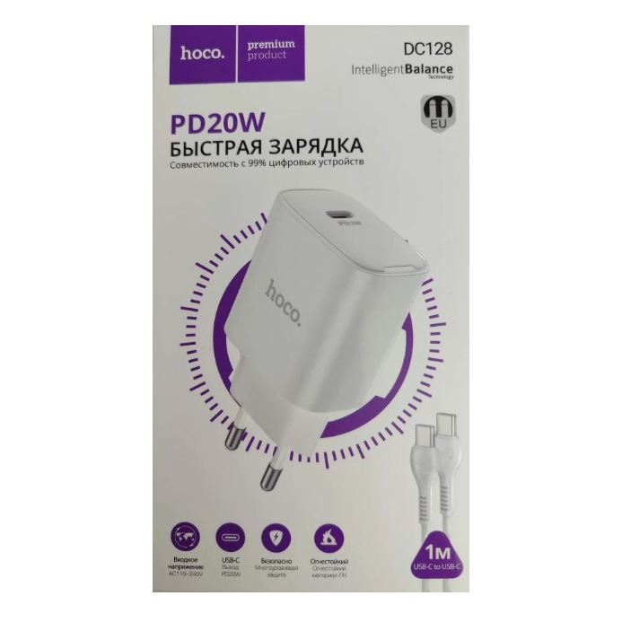 Сетевое ЗУ HOCO DC128 + кабель Type-C/Type-C (PD 20W) белое