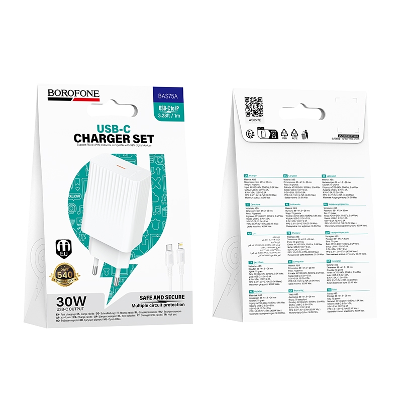 Сетевой адаптер питания BOROFONE BAS75A PD 30W + кабель Type-C - Lightning (белый)