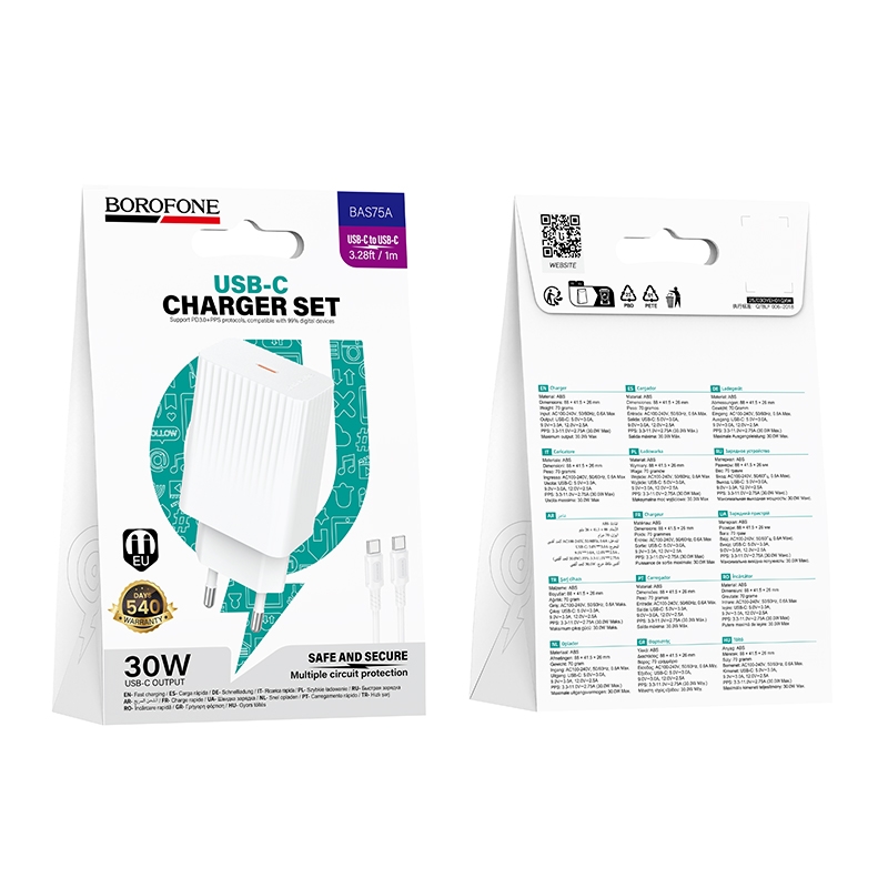 Сетевой адаптер питания BOROFONE BAS75A PD 30W + кабель Type-C - Type-C (белый)