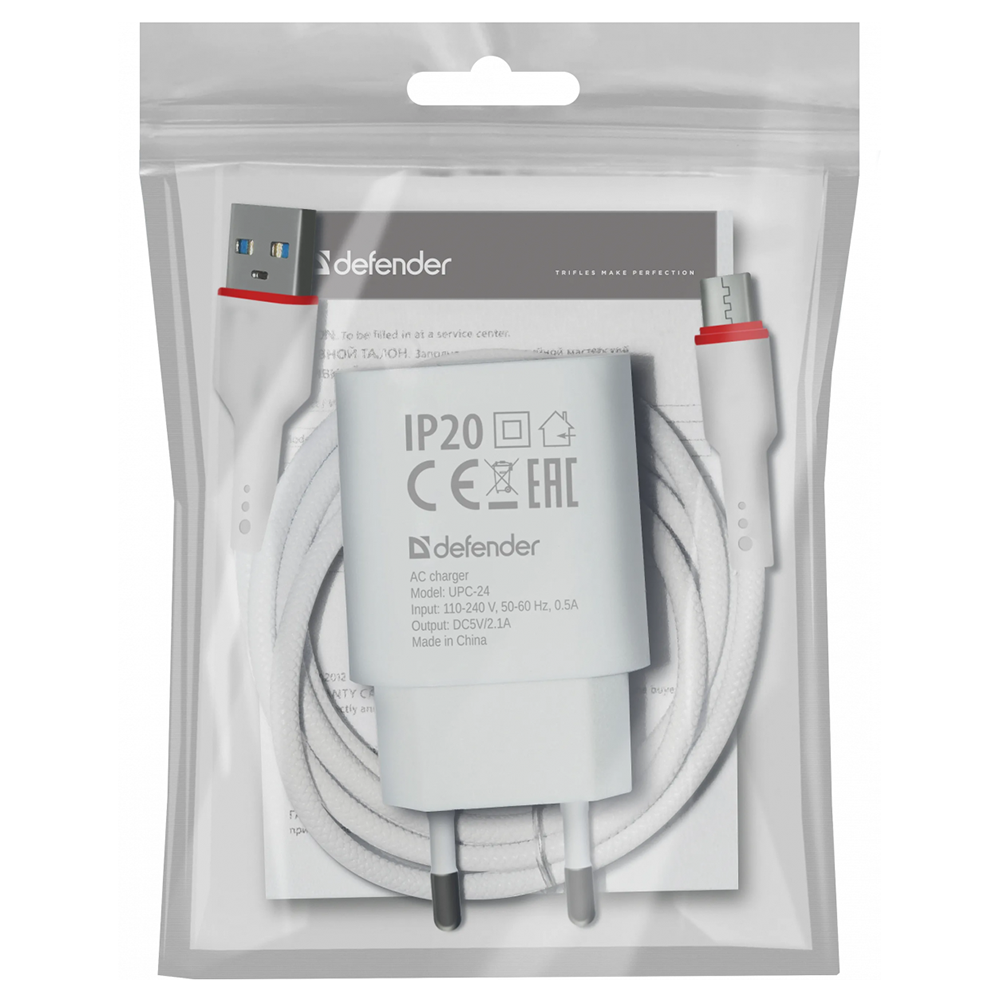 Блок питания сетевой 2 USB DEFENDER UPC-24 5V/2.1А,кабель Type-C, белый (1/50/200)
