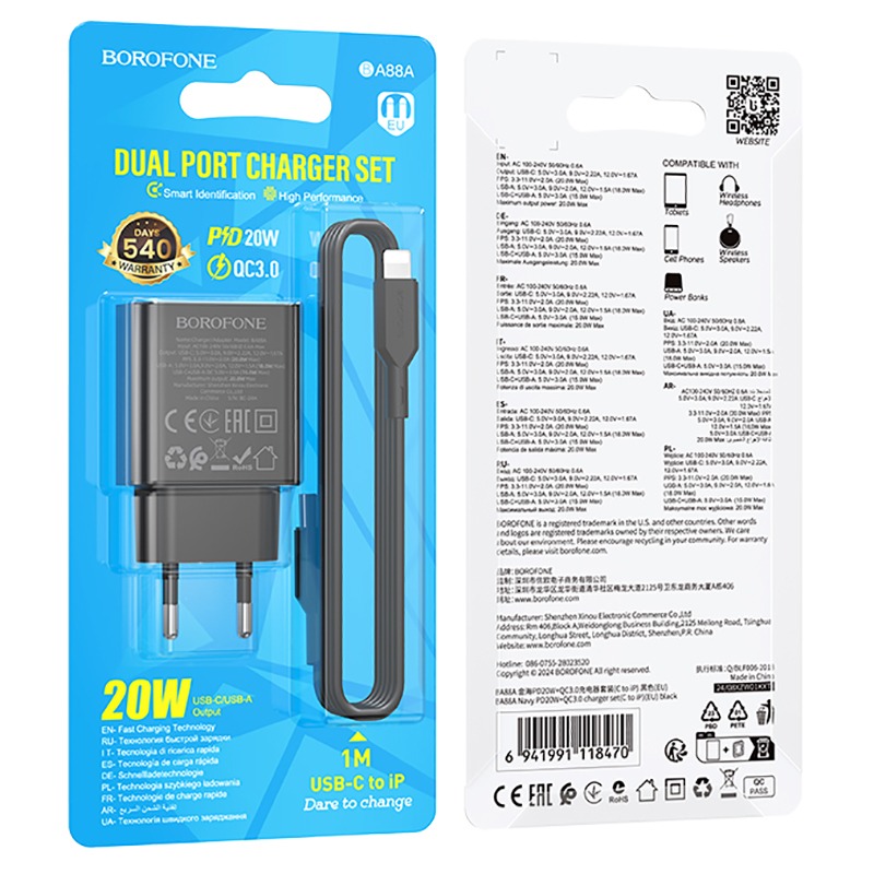 Блок питания сетевой 1 USB, 1 Type-C Borofone BA88A Navy, пластик, PD20Вт, QC3.0, кабель Type-C - 8 pin, цвет: чёрный (1/60/240)