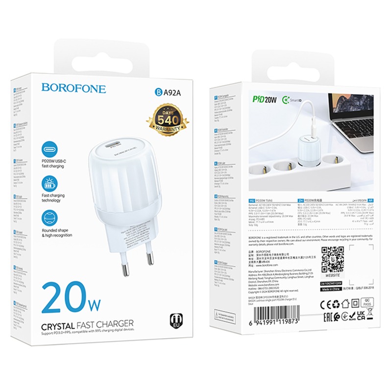 Блок питания сетевой 1 Type-C Borofone BA92A Lustrous, пластик, PD20Вт, QC3.0, цвет: синий (1/30/120)