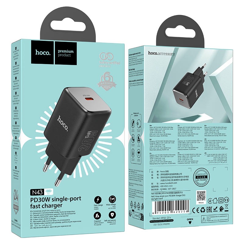 Блок питания сетевой 1 Type-C HOCO N43 Vista, 3000mA, пластик, QC3.0, PD30Вт, цвет: чёрный (1/12/120)