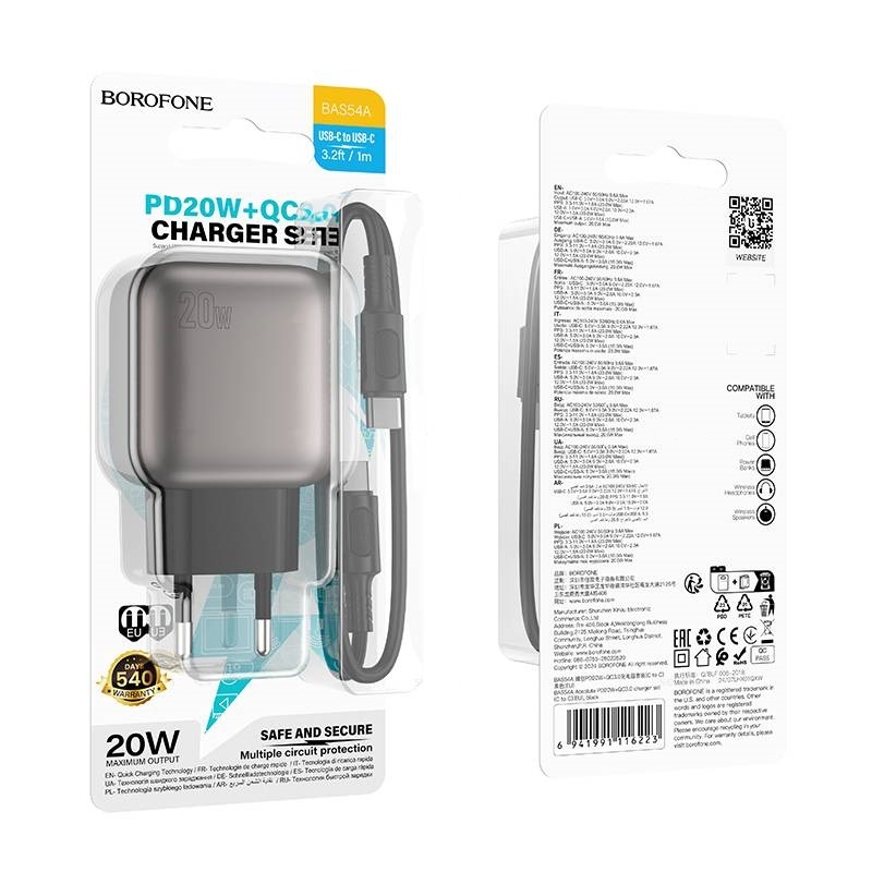 Сетевой адаптер питания BOROFONE BAS54A PD 20W + QC 3.0 + кабель Type-C - Type-C (черный)