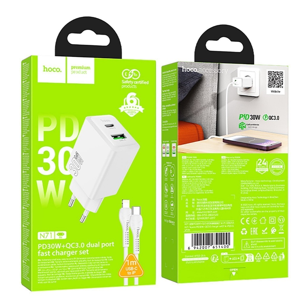 Адаптер сетевой Hoco N71 Nuevo PD+QC3.0 USB/Type-C 3A/30W + кабель Type-C/Lightning (белый)