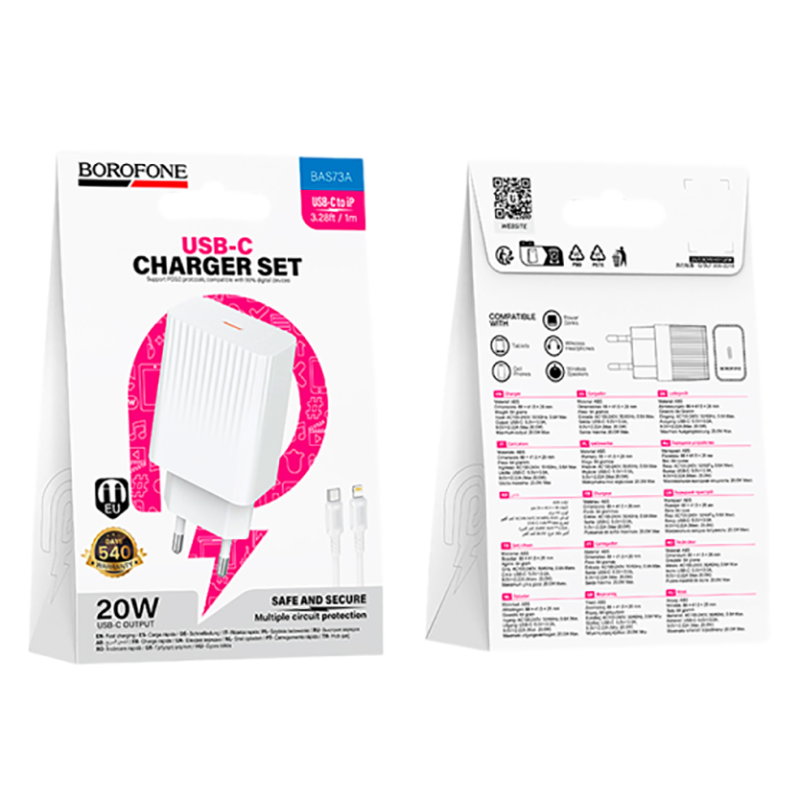 Сетевое З/У Borofone BAS73A Type-C 20W с кабелем Lightning/Type-C белый (1/20/120)
