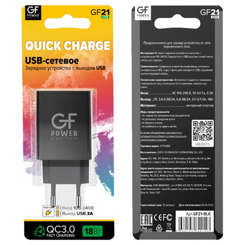 Сетевое З/У GFPower GF21 1USB 3.0A QC3.0 черный (83/332)
