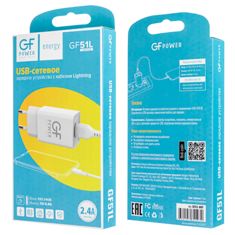 Сетевое З/У GFPower GF51L 1USB 2.4A с кабелем Lightning белый (1/120/480)