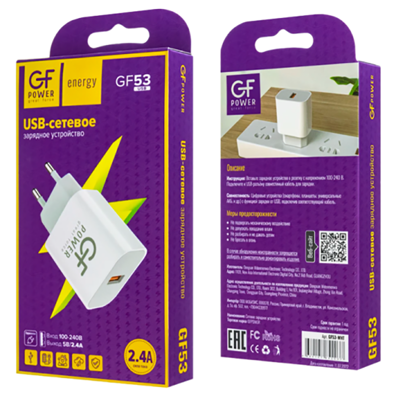 Сетевое З/У GFPower GF53 1USB 2.4A белый (1/108/432)