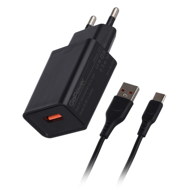 Сетевое З/У GoPower GP1U 1USB 2.4A 12W с кабелем Type-C черный (1/200)