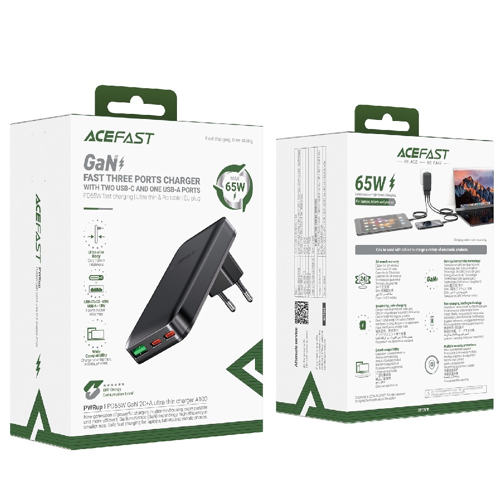 Сетевое зарядное устройство ACEFAST A100 PD65W GaN (2C1A), цвет черный