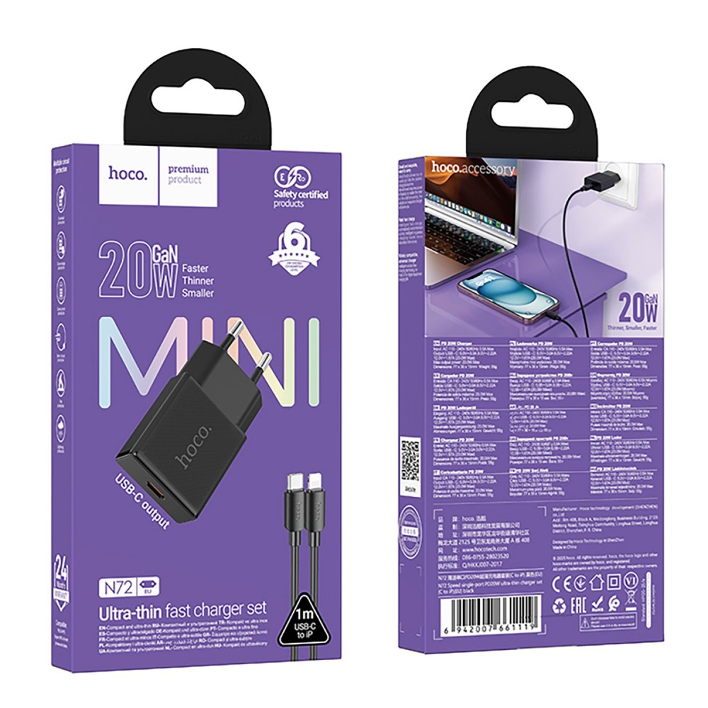 Адаптер сетевой Hoco N72 Mini PD Type-C 3A/20W + кабель Type-C - Apple Lightning (black)