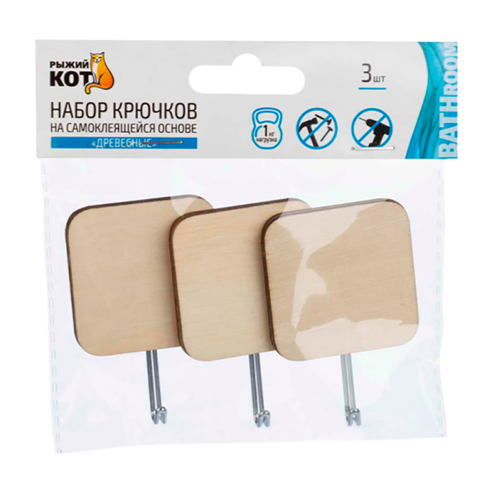 Крючки Рыжий кот "Древесные" клеевая основа 4.5х4.5х2.5см 3шт. дерево (1/24/384)