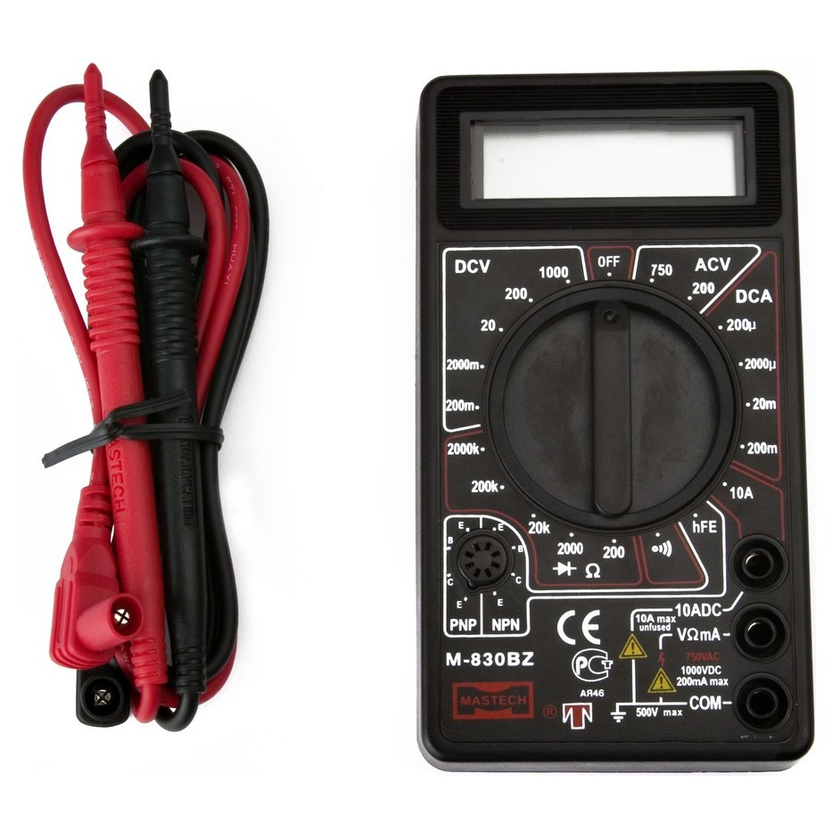 Цифровой мультиметр Mastech M830BZ производит измерения силы постоянного и переменного тока, величины постоянного и переменного напряжения, сопротивления и коэффициент усиления биполярных транзисторов (h21). Так же с помощью мультиметра M830BZ можно прозванивать полупроводниковые диоды. Результаты измерений выводятся на цифровой 31/2 -разрядный ЖК-дисплей. Питание мультиметра осуществляется от одной батареи 9В типа "Крона". В комплекте поставки мультиметра Mastech M830BZ входит комплект щупов.