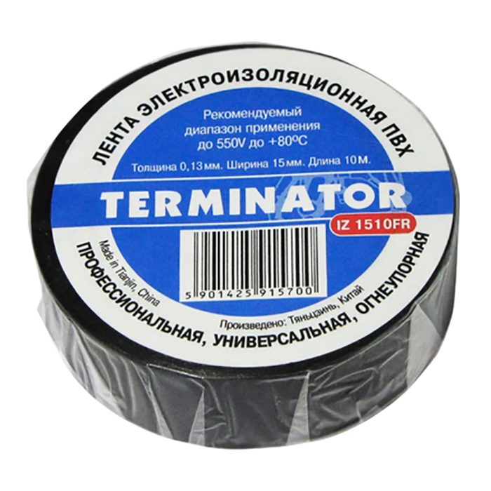 Изолента Terminator IZ1510FR, 15/10, не горючая, самозатухающая, 0,13мм чёрный
