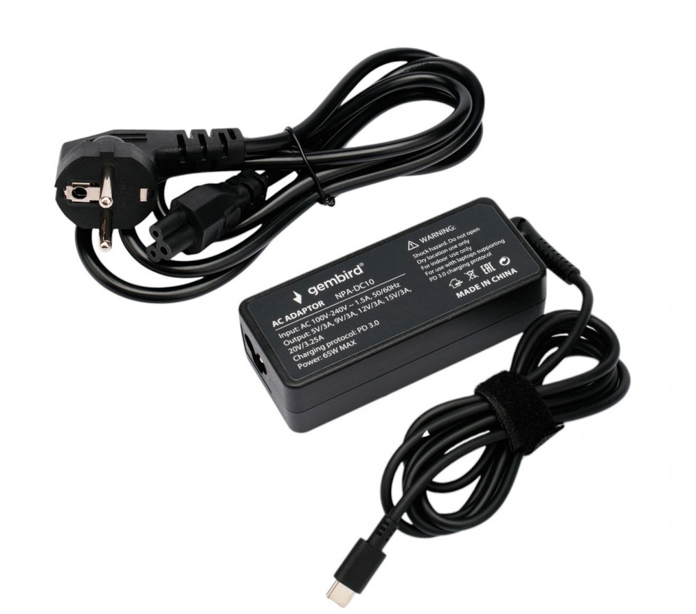 Блок питания для ноутбуков 5В/3A, 9В/3A, 12В/3A, 15В/3A, 20В/3.25A PD3.0 DC 65W шт.Type-C Gembird