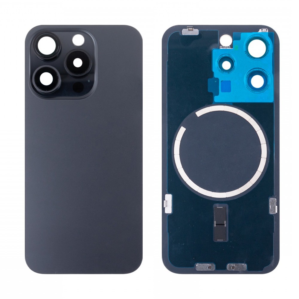 Задняя крышка для iPhone 15 Pro (A3102) в сборе со стеклом камеры Черный (стекло, монолит, MagSafe, логотип) - Премиум