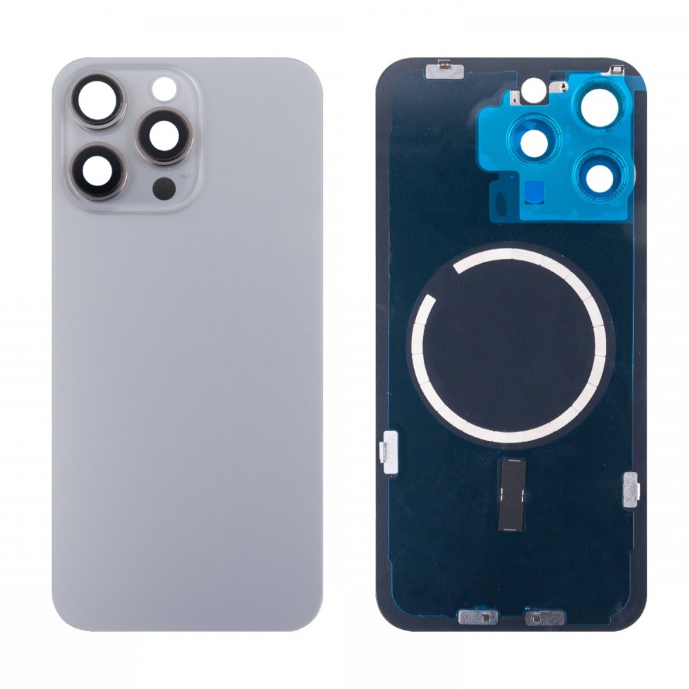 Задняя крышка для iPhone 15 Pro Max в сборе со стеклом камеры Серый (стекло, MagSafe, логотип) - Премиум