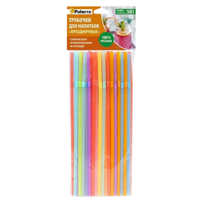 Трубочки для коктейлей "ПРАЗДНИЧНЫЕ", разноцветные, с изгибом, 23*0,5см, 50шт. в уп., PATERRA (1/48)