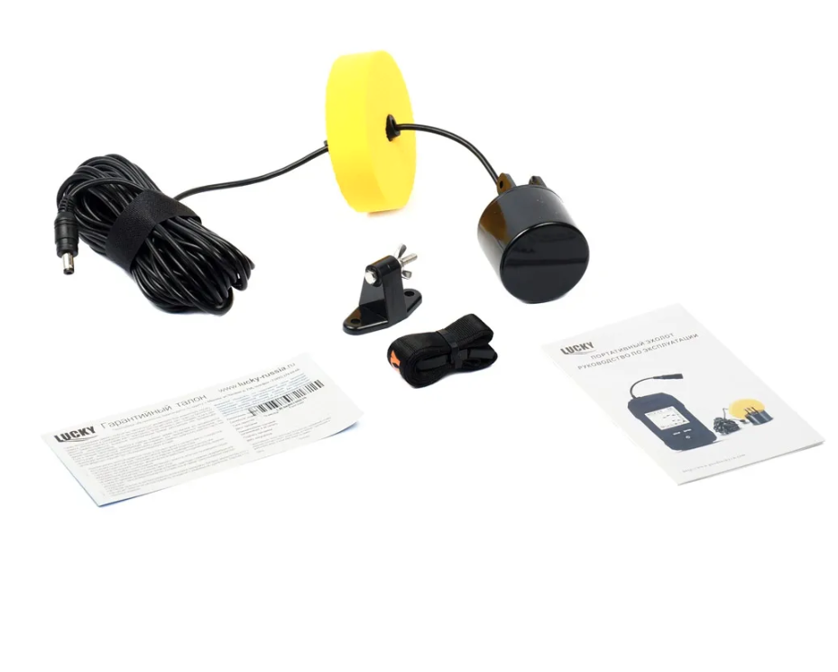 Эхолот для рыбалки FL068; Проводной датчик (8м) с поплавком; Крепление на транец; Инструкция (на русском языке); Шейный ремешок; Гарантийный талон